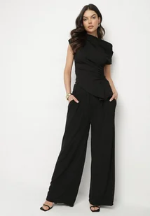 Czarny Komplet Asymetryczna Bluzka z Marszczeniem i Szerokie Spodnie Filuriela