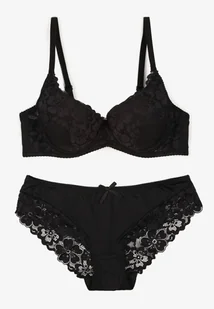 Czarny Komplet Biustonosz i Majtki Typu Figi Ozdobiony Koronką Ezivane