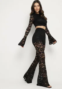 Czarny Komplet Koronkowy Bluzka i Spodnie Dzwony Nanireas