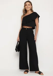 Czarny Komplet z Wiskozą Asymetryczny Top z Falbanką i Szerokie Spodnie Niraleine