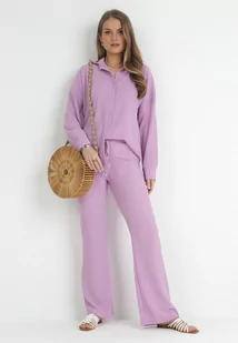 Fioletowy 2-częściowy Komplet z Koszulą i Spodniami z Tłoczonej Tkaniny Benneta