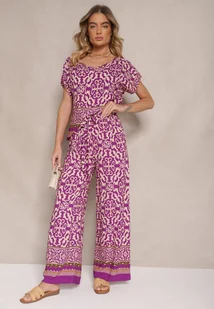 Fioletowy Komplet Spodnie i Bluzka z Bawełny w Ornamentalny Print Nanitria