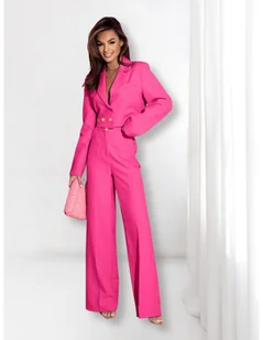 Garnitur z szerokimi spodniami ARONA - fuksjowy Zachwycaj w każdej sytuacji w eleganckim damskim garniturze, który łączy klasykę z odrobiną nowoczesności! Krótka marynarka z podszewką, zapinana na ozdobny złoty guzik, to kwintesencja szyku i wyjątkowego stylu. Spodnie typu dzwony z szlufkami w pasie doskonale podkreślają talię, jednocześnie wydłużając optycznie sylwetkę. Ten gotowy outfit to idealne rozwiązanie na wyjątkowe okazje – od eleganckich przyjęć po wieczorne wyjścia. Możesz również zestawić marynarkę z dopasowaną spódnicą czy jeansami, a spodnie połączyć z klasycznym topem lub swetrem, tworząc nowe, unikatowe stylizacje. Dopełnij look złotymi szpilkami i torebką w pastelowym odcieniu, by podkreślić elegancję i kobiecość.