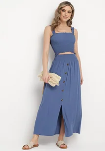 Granatowy 2-częściowy Komplet Bawełniany z Topem i Spódnicą Maxi Semija