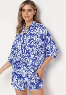Granatowy Dwuczęściowy Komplet Koszula z Regulowanym Rękawem Szorty z Gumką w Pasie Bellagrace