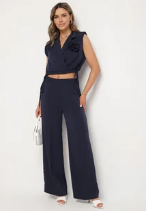 Granatowy Komplet Kopertowa Bluzka z Kwiatową Broszką i Szerokie Spodnie Reavilia