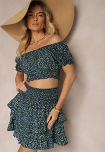 Granatowy Komplet w Kwiaty Bluzka Hiszpanka Spódnica z Falbankami i Gumką w Talii Ristelle