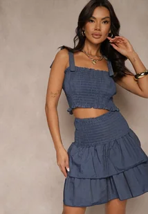 Granatowy Komplet Bawełniany Top z Kokardkami i Spódnica z Falbanami Zaliella
