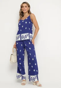 Granatowy Wiskozowy Komplet Koszulka na Ramiączkach i Spodnie w Kwiaty Adisira