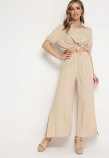 Jasnobeżowy Bawełniany Komplet z Krótką Koszulą i Szerokimi Spodniami z Rozcięciami Denara