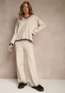 Jasnobeżowy Dzianinowy Komplet z Ozdobną Lamówką Sweter i Szerokie Spodnie Ralenae