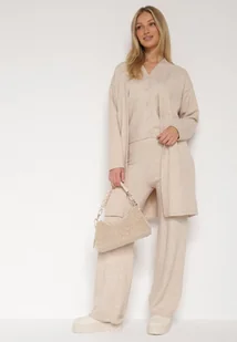 Jasnobeżowy Komplet z Dzianiny z Wełną Spodnie Kardigan i Kamizelka na Guziki Meviseffa