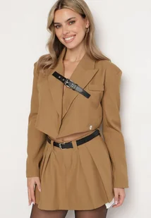 Jasnobrązowy Garniturowy Komplet Krótka Marynarka z Paskiem i Plisowane Spódnico-Spodenki Rosivia