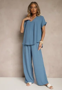 Jasnoniebieski Komplet Bluzka i Luźne Spodnie z Wiskozą i Kieszonkami Efraria