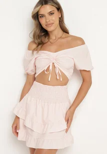 Jasnoróżowy Komplet z Bawełną Bluzka Hiszpanka z Bufiastymi Rękawami Spódnica z Gumką w Pasie Testarae