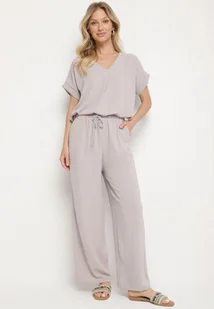 Jasnoszary Komplet z Wiskozą Koszulka z Krótkim Rękawem i Luźne Spodnie na Gumce z Kieszniami Efraline