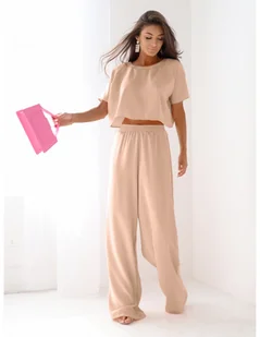 Komplet bluzka z szerokimi spodniami RAVEN - beżowy Odkryj idealny komplet RAVEN – połączenie stylu i komfortu na każdą okazję! Krótka bluzka z reglanowym rękawem to must-have, który podkreśli Twoją sylwetkę i doda odrobiny miejskiego szyku. Szerokie spodnie na gumce zapewniają swobodę ruchów i wygodę, a ich luźny krój świetnie sprawdzi się zarówno na gorące, jak i chłodniejsze dni. Miękki, przyjemny materiał sprawi, że nawet najbardziej upalne dni będą komfortowe w noszeniu. Zestaw z sneakersami i casualową torebką na co dzień, albo dodaj eleganckie sandały i delikatną biżuterię, by stworzyć look na spotkanie z przyjaciółmi czy weekendowy wypad. Komplet RAVEN to uniwersalny wybór, który podkreśli Twój indywidualny styl i zapewni komfort na każdym kroku! Postaw na pastele - wybierz komplet w kolorze beżowym.