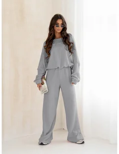 Komplet dzianinowy z szerokimi spodniami MILENA - szary Ten komplet to idealne połączenie swobodnej elegancji i wygody, które sprawdzi się w każdej garderobie. Oversizowa bluza z szerokimi rękawami i lekko opadającym dekoltem nadaje całości nonszalanckiego charakteru, a elastyczny dół subtelnie podkreśla sylwetkę. Dopełnieniem zestawu są szerokie spodnie z wysokim stanem, które zapewniają pełną swobodę ruchów i optycznie wydłużają nogi. Miękka, przyjemna w dotyku dzianina sprawia, że komplet jest doskonałym wyborem zarówno na co dzień, jak i na bardziej dopracowane stylizacje. Możesz zestawić go ze sneakersami dla casualowego looku lub dobrać eleganckie akcesoria, tworząc efektowną stylizację na wyjście.