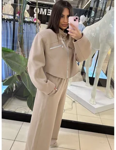 Komplet krótka kurtka + spodnie MONTI - mocha mousse Ten komplet w stylu motocyklowym to propozycja dla kobiet, które lubią łączyć wygodę z wyrazistym, modowym akcentem! Krótka kurtka typu bomberka z poduszkami na ramionach, podszewką i srebrnym zamkiem nadaje całości charakteru inspirowanego streetwearem i stylem biker chic. Wykonana z miękkiej, oddychającej bawełny, świetnie trzyma formę i zapewnia komfort noszenia. Spodnie z szerokimi nogawkami, elastyczną gumą w pasie i funkcjonalnymi kieszeniami idealnie współgrają z górą zestawu. Dodatkowe zapięcia na napy przy nogawkach pozwalają dopasować fason do butów – od sneakersów po masywne botki. Stylizuj ten komplet z crop topem i okularami przeciwsłonecznymi, by stworzyć miejski look z pazurem.