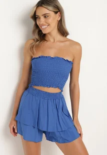 Niebieski Bawełniany Komplet Krótki Top bez Ramiączek Szorty z Gumką w Pasie i Falbanką Tesmara