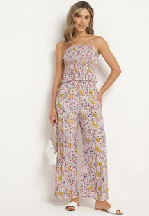 Różowo-Fioletowy Bawełniany Komplet Top na Ramiączkach z Marszczeniami Spodnie z Gumką w Pasie Elaruth