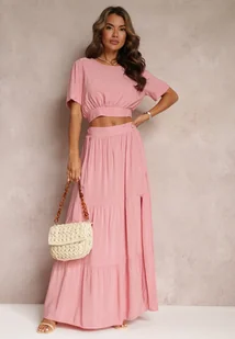 Różowy Komplet z Wiskozy 2-Częściowy Top i Spódnica z Falbankami Jakki