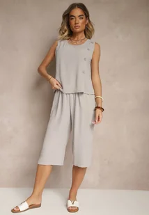 Szary Komplet Spodnie 3/4 Luźne i Koszulka bez Rękawów Ozdobiona Guzikami Ravione