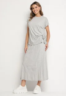 Szary Komplet z Wiskozą Spódnica i Bluzka z Wiązaniem Davissael