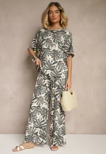 Szary Komplet z Wiskozy Zdobiony Roślinnym Printem T-shirt i Szerokie Spodnie Evialena