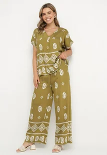 Zielono-Biały Bawełniany Komplet Koszula i Szerokie Spodnie w Stylu Boho Ollirive