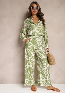 Zielony 2-Częściowy Komplet z Wiskozy Koszula z Długim Rękawem i Szerokie Spodnie Yiseria