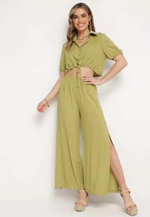 Zielony Bawełniany Komplet z Krótką Koszulą i Szerokimi Spodniami z Rozcięciami Denara