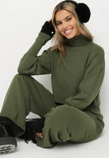 Zielony Komplet Dzianinowy z Wiskozą Bluza Golf ze Ściągaczami i Szerokie Spodnie Noridra