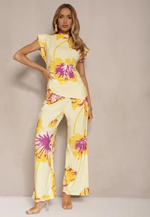 Żółty Komplet Marszczona Bluzka o Asymetrycznym Kroju i Szerokie Spodnie w Kwiaty Linidia