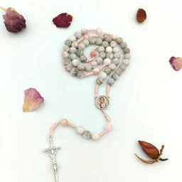 Różaniec 8mm "Wybór Miłości" Wybór Miłości to pełny różaniec wykonany z naturalnych kamieni 8 mm: matowego jadeitu w delikatnej, stonowanej palecie bieli, szarości, beżu i pudrowego różu. Matowe wykończenie nadaje całości spokojny, klasyczny wygląd bez nadmiaru blasku, za to z miękką elegancją, która pasuje do codziennej modlitwy i do ważnych chwil. W centrum znajduje się łącznik z wizerunkiem bł. Karoliny Kózkówny młodej dziewczyny, której życie stało się świadectwem wiary, czystego serca i odwagi.