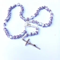Różaniec ceramiczny z łącznikiem Matki Boskiej i Pana Jezusa Ten wyjątkowy różaniec został wykonany z wysokiej jakości, ręcznie formowanej ceramiki. Każde paciorki mają delikatny połysk i subtelne niuanse kolorystyczne, które nadają całości elegancki, a zarazem duchowy charakter. Paciorki są gładkie i przyjemne w dotyku, dzięki czemu modlitwa staje się jeszcze bardziej medytacyjna. Centralnym elementem różańca jest ozdobny łącznik mała medalionowa część, która łączy trzy sekcje paciorków. Przedstawia on wizerunek Matki Boskiej po jednej stronie, a Pana Jezusa po drugiej, co symbolizuje ich nierozerwalną więź oraz obecność w każdej modlitwie różańcowej.