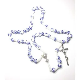 Różaniec ceramiczny niebieskie kwiatuszki Piękny i niepowtarzalny różaniec ręcznie wykonany z ceramicznych paciorków z niebieskimi kwiatuszkami, ręcznie malowanymi. Delikatny, a zarazem wyrazisty przyciąga uwagę swoją unikalną formą i głęboką symboliką. Cechy produktu: Materiał: ceramika Łącznik: wizerunek Matki Bożej (np. Niepokalanej lub Częstochowskiej) Krzyż: