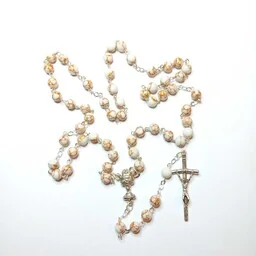 Złoty kolor w różańcu przypomina katolikowi o drodze doświętości i wiecznej jedności z Bogiem. Modlitwa na różańcu wykonanym zbiało-złotego howlitu może pomóc wierzącemu w osiąganiu spokojuwewnętrznego, harmonii oraz skupieniu na duchowych wartościach. Różaniecz biało-złotego howlitu to nie tylko elegancki i trwały przedmiot, alerównież narzędzie duchowego wzrostu, które przypomina o czystości serca,mądrości Boga oraz drodze do zbawienia. Elementy metalowe różańcawykonane są ze stali nierdzewnej posrebrzanej. Medalik kielich IHS ikrzyżyk papieski są odlewami w kolorze srebrnym.