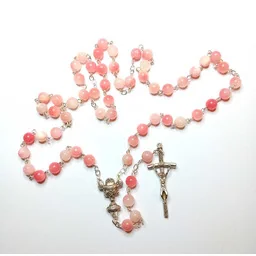 Różowy jadeit symbolizuje również czystośćserca, łagodność i życzliwość, przypominając wierzącym o koniecznościwyrażania miłości i współczucia w swoim życiu codziennym. Dla dziecka,które przystępuje do Pierwszej Komunii, różaniec z różowego jadeitu możebyć symbolem Bożej miłości i duchowego wzrostu. Modlitwa naróżańcu wykonanym z tego kamienia może pomóc wierzącemu w nawiązywaniugłębszej relacji z Bogiem, przynosząc wewnętrzny pokój i przypominając obezwarunkowej miłości Boga. Jest to wyjątkowy kamień, który nie tylkoemanuje pięknem, ale także wspiera duchową podróż i kontemplację. Różaniec jest łączony na posrebrzane sztyfty, z łącznikiem kielicha,i krzyżykiem papieskimRozmiar koralika: