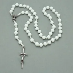 Różaniec wykonany ręcznie w naszej pracowni. Powstał z agatu w kolorze białym (6mm) i elementów metalowych w kolorze srebrnym. Ten piękny różaniec jest zapakowany w ozdobne firmowe opakowanie. Idealny pomysł na prezent na chrzest, komunię, bierzmowanie, itd. Materiały: Kamienie: jadeit (6mm)Nić: