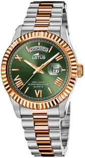 Zegarek męski L18856-3 marki Lotus to stylowe połączenie funkcjonalności oraz ciekawego wzornictwa. Niebanalny wygląd czasomierza uzyskano również dzięki tarczy w kolorze zielonym. Godzina pokazywana jest w sposób analogowy co intuicyjnie pozwala ją odczytać. Koperta szeroka jest na 41 mm - ma okrągły kształt. Lotus to zegarki produkowane w Hiszpani już ponad 30 lat.