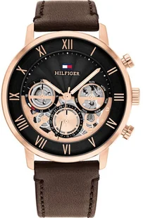 Zegarek męski 1710566 marki Tommy Hilfiger to idealne połączenie funkcjonalności oraz modnego designu. Model ten należy do kolekcji Tommy Hilfiger Legend. Charakteru nadaje wysokiej klasy tarcza w kolorze czarnym. Aktualna godzina prezentowana jest w sposób analogowy co intuicyjnie pozwala ją odczytać. Koperta została ozdobiona kolorem różowo złotym szeroka jest na 44 mm - charakteryzuje się okrągłym kształtem.