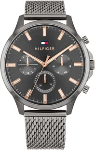 Tommy Hilfiger 1710500 - męski zegarek przeznaczony dla osób szukających zegarka z serii Tommy Hilfiger Ryder. Stylu dodaje wysokiej klasy tarcza w kolorze grafitowym. Aktualna godzina przedstawiona jest w sposób analogowy co niezmiernie łatwo pozwala ją odczytać. Koperta w barwach koloru stalowego szeroka jest na 44 mm oraz ma grubość 11 mm - w kształcie okrągłym. Tommy Hilfiger tej marki nie trzeba przedstawiać nikomu kto interesuje się modą.