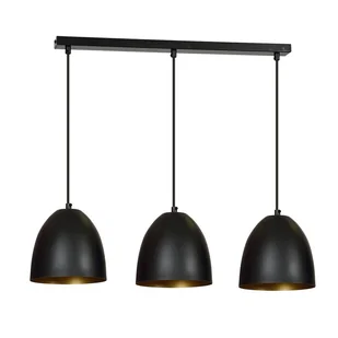 Listwa sufitowa do nowoczesnych salonów i jadalni. Listwa sufitowa składająca się z trzech lamp wiszących z kolekcji Jonix. Światło jest emitowane przez dolną część kloszy, idealne do oświetlenia stołu lub wyspy kuchennej. Czarny metal ze złotym wnętrzem. Wymiary: Wysokość max.