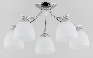 Lampa sufitowa 5 punktowa ze szklanymi matowymi kloszami. Elementy metalowe wykończone w chromie.
