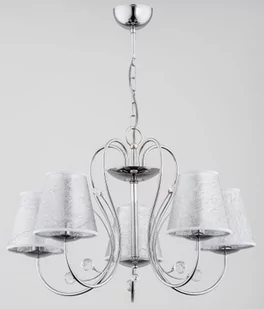 Żyrandol 5 punktowy z abażurami z tworzywa sztucznego pokrytego srebrno-szarym włóknem. Elementy metalowe wykończone w chromie. Regulacja wysokości poprzez samodzielne wypięcie ogniwek łańcucha. Lampa przyozdobiona kryształkami. Możliwość podłączenia lampy tak, aby świeciły dwie żarówki lub trzy lub wszystkie (pod warunkiem, że instalacja w pomieszczeniu jest rozdzielona na 2 obwody).