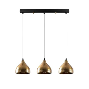 Lampa sufitowa z kolekcji Asney. Oświetl stół w jadalni lub wyspę kuchenną za pomocą tej wiszącej listwy oświetleniowej. Klosze wykonano z metalu w złotym kolorze z dekoracyjnym efektem tłoczenia. Złota lampa sufitowa do montażu w salonach i nowoczesnych kuchniach: Wysokość maks.
