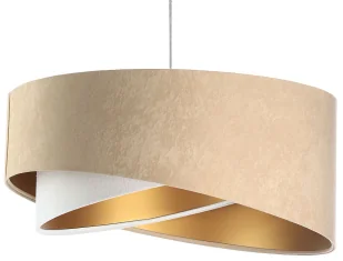 Styl: nowoczesny, glamour Materiał: wysokojakościowa, szlachetna tkanina welurowa, trwałe tworzywo PCV, metal Kolor: beżowy (złote wnętrze) Źródło światła: E27, max. 60W Wymiary: średnica abażura - 50 cm, wysokość abażura - 23 cm, wysokość całkowita - 105 cm, długość przewodu - 80 cm Żarówki w komplecie: