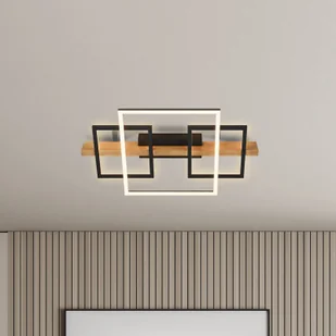 Wyrazista lampa sufitowa LED Cadre z efektownym elementem drewnianym Lampa sufitowa LED Cadre łączy w sobie nowoczesny design z funkcjonalnym oświetleniem. Wykonana z harmonijnego połączenia drewna, metalu i tworzywa sztucznego, lampa idealnie pasuje do różnych pomieszczeń mieszkalnych, takich jak salon, jadalnia, przedpokój i kuchnia. Ciepła biel światła o temperaturze 3000K zapewnia przyjemną atmosferę, która działa relaksująco i zachęcająco. Dzięki kolorystyce w matowej czerni i jasnym drewnie lampa stanowi stylowy akcent i doskonale uzupełnia nowoczesne style wyposażenia wnętrz. Źródła światła lampy sufitowej można sterować niezależnie od siebie (wszystkie włączone, tylko podświetlenie, wszystkie wyłączone).