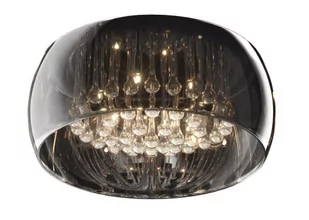 Elegancka lampa sufitowa z dużym szklanym posrebrzanym kloszem oraz kaskadą transparentnych kryształowych sopli. Elementy metalowe wykończone w chromie.